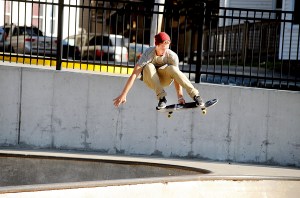Max Bristol, 19, of Lewiston flies between bowls at the skate park in Lewiston on Monday. Bristol said he has been skating at the park since it was built in 2006.