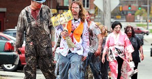 A pack of roving zombies led by Ron Lawlor, Jr., right, and Roger Beaudoin wander downtown Lewiston on Halloween afternoon. The 5th Annual Lewiston Zombie Walk was co-created by Lawlor and Stephan Bernard as a way to have fun with friends without spending a lot of money. They also hope to turn it into a fundraising event for local charities in the up coming years. To see a video visit sunjournal.com/lewistonzombiewalk2012.