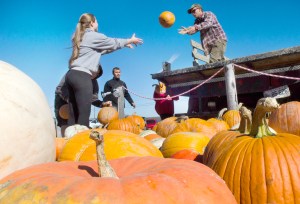 Vasya Kryvoshievei tosses a pumpkin from the back of his company truck to Bekah Gray of Auburn, an employee at Wallingford’s Fruit House in Auburn on Monday afternoon. Peter Wallingford said he can’t grow enough on his land to keep up with the demand, so he has a number of deliveries throughout the season from a friend he went to school with that has a big pumpkin farm in Dayton.