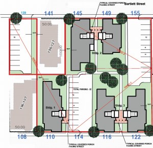 The St. Laurent project calls for 29 units in three buildings on eight lots. Her apartments would replace buildings she owned at 149 Bartlett St., and 110 and 114 Pierce St. that were destroyed in a rash of downtown fires in May 2013. The project also includes five empty lots owned by the city that had been tax-acquired.