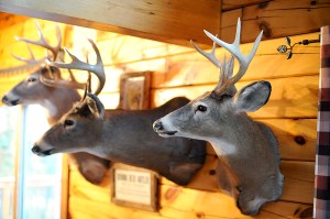 It leaps from the picture frames he’s gathered around the thick, wood table inside his log cabin. It treads across the hardwood floor and crawls up a wall to settle on the first deer she shot, mounted next to his own trophies.