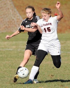 Olivia Maynard made five of her seven saves in the first half for Hall-Dale. The left post stopped two more point blank bids by Lisbon, one on each side of intermission.