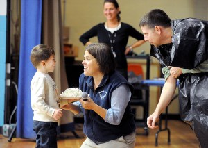 Niklas Hollinger, center, and Assistant Principal Cindy Gish react after Hollinger was the first student to throw a pie into Principal Jim Cliffe’s face during a school assembly at Montello Elementary School in Lewiston on Thursday. Hollinger, a prekindergarten student in Ruth Joyce’s classroom, sold the most pies during a Parent Teacher Friends Club fundraiser. The pie throw followed an assembly that recognized students for respectful, safe and responsible behavior.