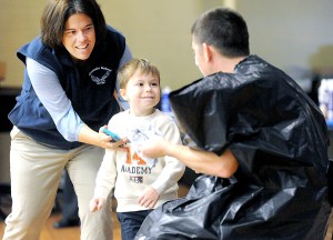 Niklas Hollinger, left, takes the stage after being selected to throw the first pie into Principal Jim Cliffe’s face during a school assembly at Montello Elementary School in Lewiston on Thursday. Hollinger, a prekindergarten student in Ruth Joyce’s classroom, sold the most pies during a Parent Teacher Friends Club fundraiser. The pie throw followed an assembly that recognized students for respectful, safe and responsible behavior. Assistant Principal Cindy Gish, center, hands the pie to Hollinger.
