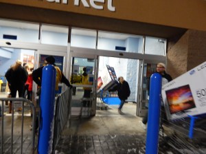 One woman arrived at Wal-Mart just after 11 p.m. She and her husband made the long walk to the end of a line that stretched all the way to the doors of Lowe’s. They took their place and waited, sipping coffee and looking around. The woman shuffled from one foot to the other, trying to stay warm. She clutched her cup of coffee and tried to breathe in its warmth. She was there three minutes and the end of her nose was already bright red.