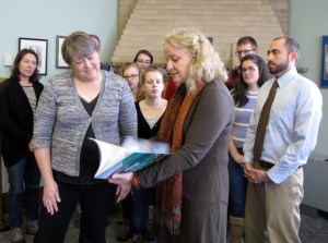 They brought a token of friendship back from Lac-Megantic’s rebuilt library and presented it to Librarian Marnie Stockford at Farmington Public Library on Wednesday.