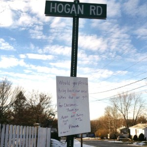 LEWISTON — The signs in front of the Hogan Road house simply read, “Would you please bring back our new bikes that we got for Christmas — thank you.”