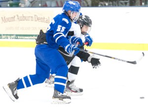 It was an emotional night for the Saints, who lost a member of their hockey family earlier in the week in a car accident. St. Dom’s hung Casey Cloutier’s jersey on the wall over the team’s bench throughout the night, including both the JV game and girls’ contest. Cloutier was a freshman on the Saints’ JV squad. Both teams observed a moment of silence prior to the start of the game.