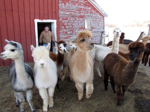 “They are super curious,” Simoneau said as 13 male alpacas quickly surround Butler. A large guard dog, a Great Pyrenees named Gypsy, comes first.