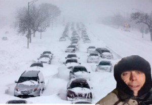 The picture is a graphic with Webster’s face — complete with a heavy snow hat — in the foreground and lines of snowed-in vehicles on a highway in the background.