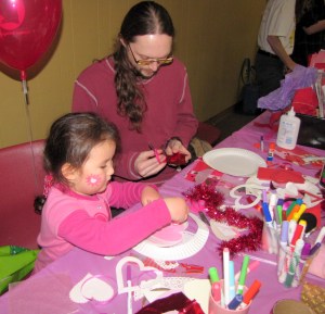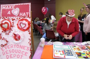 Board members and staff from Everyone’s Resource Depot helped children make valentine hats out of a variety of colorful and recycled materials. The two tables were filled as parents helped their youngsters turn paper plates into colorful creations.