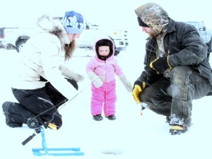 One young family, Meghann and Russ Waugh of Mexico, were seen trying to coax their 18-month-old daughter, Ava, to move closer to the fishing hole, but she was hesitant to do that.