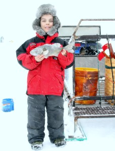 Seven-year-old Brycen Waugh said he was enjoying his day of fishing, showing off a 15-inch bass that he caught earlier during the ice-fishing derby, one of three fish he had caught on the day.
