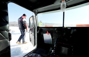 They loaded the 2,500-pound cab on a trailer and drove to Roxbury Pond to unload it on Jan. 1. The ice was thick enough to hold the novelty fishing shack. They used Riley’s four-wheelers side-by-side to pull it across the ice to French Island and parked it just off shore.