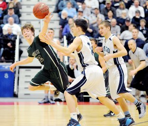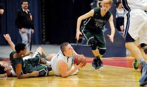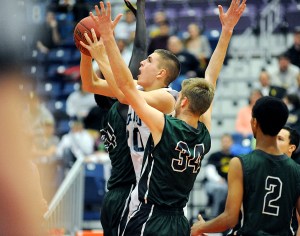 The Cougars took an aggressive, face-guarding stance against Flyers’ guards Milo Belleau and Harry Baker-Connick. Waynflete only turned it over seven times, but the Flyers were forced to dump the ball inside, where the Cougars had a decided advantage with tournament veterans Swett and Hutchins.