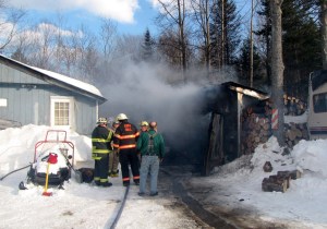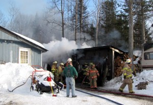 Charlie Green was working on a snowmobile in the garage and started the wood stove to dry out the seat, he said at the scene. He went into his home for a cup of coffee and found the garage on fire when he came back.