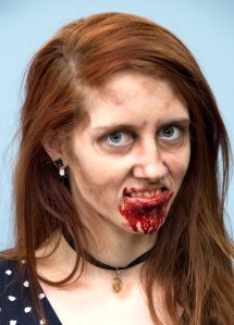 Casavant volunteers again to become his model. He carefully pastes the skin to her face and dabs dark makeup around her eyes and along the ridges of zombie scars.