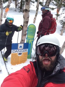 Ben Taylor skis with friends and Sunday River coworkers, Taylor Danielson, left, and Justin Mossey, front, at Sugarloaf in Carrabassett Valley. Danielson and Mossey were skiing with Taylor when he died Wednesday at Sunday River ski resort in Newry.