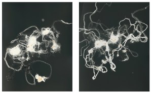 The end results, once developed, were pale squiggles, dots and misshapen star bursts on a mottled black background. She named the eventual collection “Supercluster Arion and Other Phenomena.”