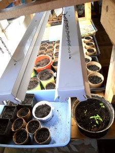 *Garden supply companies have many seed starting devices. They may look nice and work well, but they can cost a lot. Instead, build your own or ask a significant other or friend to build it for you. It takes only a few pieces of narrow wood, and a couple of long, florescent lights hanging from the top wooden pieces. Keep seedlings watered and be sure to give the seedlings 12 to 14 hours of light a day.