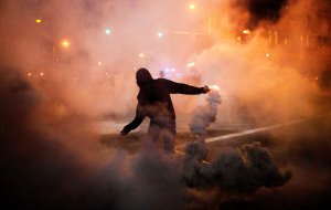 At the mall, she saw police and helicopters. She stood on the same side of the street as police with shields as teens threw bricks at the officers.