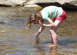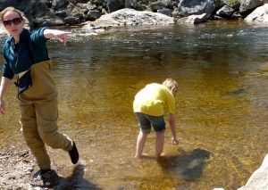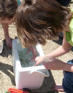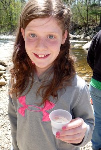 Early afternoon on Thursday, Prentice and her 15 fifth-grade students arrived with more fish hatched from 200 eggs delivered the first week of February from Boothbay Hatchery. After the students added small cups of river water to the cooler of fish to acclimate them to the sun-warmed water, the children eagerly stood in line to get a cup of fish to release in the river near stones and boulders.