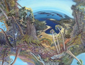 Using egg tempera paint made from her own hens, artist Amy Peters Wood of Georgetown knits together intersecting perspectives, near and far, above and below, before and after, imagined and real. These juxtapositions ultimately consolidate to form a single image, one perceived from an indeterminate vantage point. Creating planes which recede tilt and plunge, Wood reinforces the vast feeling of nature and uncertainty to the spatial dimensions within the painting. Visit Wood online at www.peterswood.com.