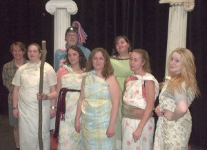 Co-directors Robin Lisherness and Karen West said that they are particularly proud of their actors who have taken on the roles of technicians as well. In true community theatre spirit, the cast is also working as costumers, prop managers, sound crew and set builders. And in a long-standing tradition, UMF students are working with the Sandy River Players. Recent graduate and secondary education major Nicole Clark has learned to program lighting cues specifically for this production, and junior art major Gabby Garnier is painting scenery to resemble book jackets for the four plays.