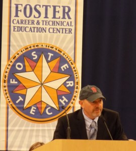 The students gathered in the courtyard before making their way, by program, into the gymnasium. Director Glenn Kapiloff asked S. Clyde Ross, Deputy Fire Chief, to give safety instructions and lead everyone in the pledge of allegiance. Aleena Warren, a Digital Media student who was videotaping the ceremony, then sang the National Anthem.