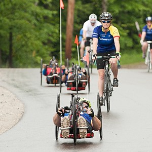 Kenny Young of Newry and Springfield, Vt., Chris Collin of Hollis and Larry Nadeau of Springfield, Vt., rode out of the Maine Adaptive Sports & Recreation parking lot and onto Skiway Road while laying on their backs and pedaling handcycles.