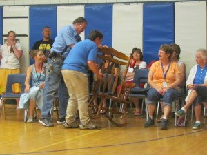 In keeping with a tradition set in the district over the past several years, Paul Gardiner, school board member, former co-worker, and close friend of Mrs. Huff, presented the honored guest with a rocking chair which he had made especially for the occasion. As Paul spoke, Dave Baker, director of facilities and transportation, and Betty White, custodian and bus driver, delivered the gift to Mrs. Huff, who enjoyed the rest of the celebration ensconced in this symbol of her retirement.