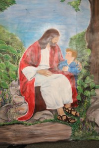 The left panel of Friday’s mural depicted Jesus and a small child in a colorful, outdoor scene. The next panel shows the rock beside the entrance of Jesus’ now-empty tomb with three crosses looming in the background. The right panel is just as gray as the middle, showing Jesus with a shepherd’s staff, knocking on a door.