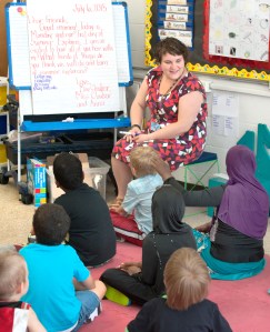 Sitting in a circle, each student took turns saying their name and favorite color. They listened as Vicky Cloutier read the day’s message.