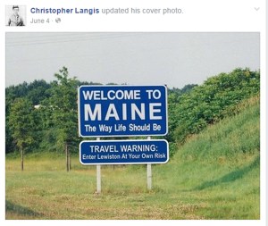 In June, Langis posted a doctored image of the Maine Turnpike sign: “Welcome to Maine, The Way Life Should Be.” The image had a matching sign just below, reading: “Travel warning: Enter Lewiston at Your Own Risk.”