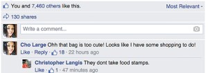 “Ohh that bag is too cute! Looks like I have some shopping to do!” Washington posted under her FB name, Cho Large, with a profile photo that clearly shows her ethnicity.