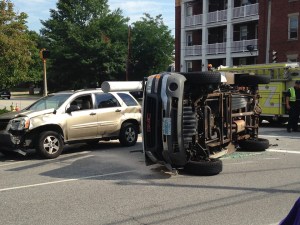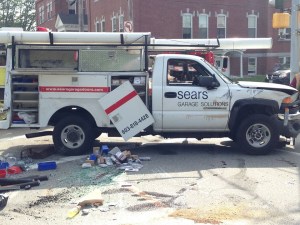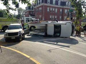 A Lewiston Police officer at the scene said it appeared the work truck ran a red light while turning left onto Ash Street, then swerved to miss an oncoming Chevy Equinox and overturned. The Chevy then struck the truck.