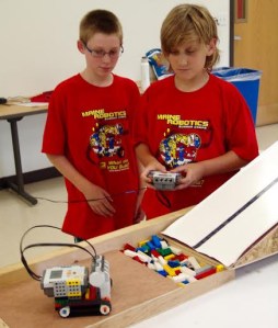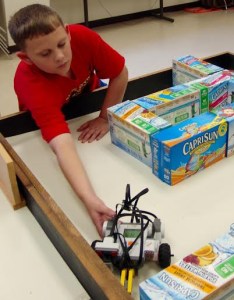 Logan Ouellette and Brady Corson, both 10, of Greene, operate a self-built robot over an incline Thursday at University of Southern Maine’s Lewiston-Auburn College. The boys were among 17 youngsters who attended the Maine Robotics Summer Camp. Children ages 9 to 12 learned basic programming and engineering design, said camp instructor Jim Rowe, also an Auburn Middle School teacher. “They start out by building robots we have planned for them. By the end, they’re doing their own creations,” Rowe said. The camp is part of a statewide network of camps sponsored by Maine Robotics. The goal is to encourage the next generation to become mechanical or electrical engineers.