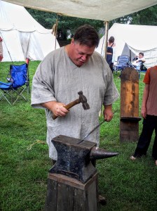 AUBURN — While a costumed Lady practiced her medieval harmonies at the front of the camp, Blacksmith Jack Harrill of Bingham kept rhythm of his own at the back, hammering at the glowing iron.