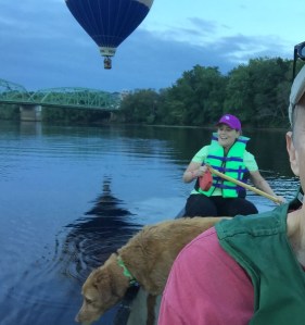 My wife, who always has good ideas, thought it would be fun to see the balloon festival from the river in our canoe for the first time. With our dog — in a canoe for the first time.