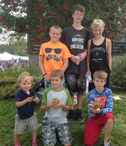 In the medium category (2 to 4 inches): third place went to Kenny Thompson’s frog Douglas and to Trevor Dolbier’s frog Speed, both of whom jumped 20 ¾ inches; second, Levi Pitt’s frog Jefferson, at 22 ¼ inches; first, Luke Gagne’s frog Little Buddy, jumping 24 inches. A.J. Demichele and Karen Porl’s frog Speckles won a prize for having been caught by the fastest catcher.