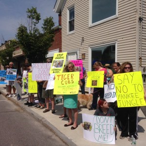 Kathy Peirce drove from Auburn, New Hampshire, to participate in the protest. The sign she held had a picture of Julie Miner holding a tiger cub by the scruff, with the words, “Stop breeding and stealing babies,” written in marker.