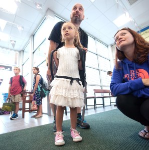 Cadence Firth, 5, was all smiles wearing a new butterfly backpack, new pink sneakers, a new white dress with ruffles and a bow. “It’s my school dress,” she said. “These are my school shoes. My daddy got me these. Pink and white are my favorite colors.”