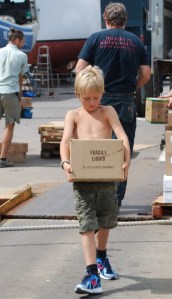 First came the pallets for the hold, then piece by piece, the freight was passed along from stevedores to crew. Soon the call went out for more shrink wrap.