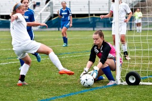Mt. Blue improved it’s lead to 3-0 with 11:39 left in the half when Haley Caswell found a loose ball on the right side of the goal after a wild scramble in the middle. Caswell calmly tapped the ball into the open net.