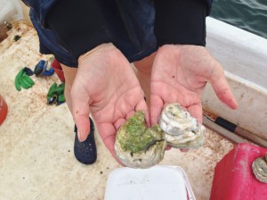 “An oyster is absolutely a product of its environment,” Carroll said, holding two oysters very different in appearance: one was smaller and white, and the other, larger and green. Both are virginicas, she said, but one had been pulled from a buoyant bag and the other from the ocean floor, a couple feet deeper.