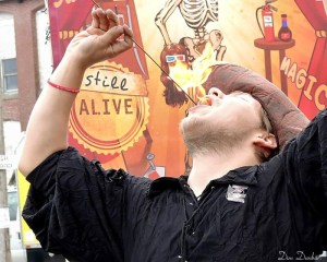 He has singed his eyebrows, however, while eating fire. To prevent that from happening again, he now has taken to stapling a card to his forehead to protect his eyebrows from the flames.