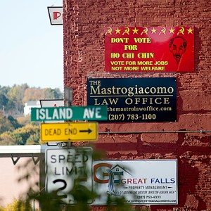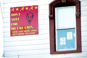 The signs that read “Don’t vote for Ho Chi Chin; vote for more jobs not welfare” were spotted on Main Street and Pine Street buildings. The Main Street sign was removed Monday morning. The bright red and yellow sign includes hammers and sickles and a cartoon caricature of Ho Chi Minh.