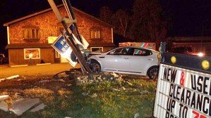 About 30 seconds after hitting the spike mats, the car crashed into a sign at R.G. Johnson Sporting Goods at 192 Portland Road in Bridgton. The driver was seen fleeing the car after the crash.