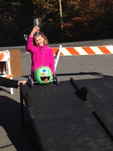 Families from the town brought pumpkins, decorated, painted and roll-able. They put wheels and spokes on the bottoms to create a movable surface. Two to three children at a time placed their pumpkin cars at the start of the track, a wooden slope whose top end reached 3 feet high.