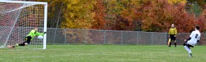 The Hawks only missed once. Mike Murphy hit the first one, knocking it in off the post. St. Dom’s tied it with a high shot from Ben Trytek. MaCaleb Reinhard made it 2-1 for Sacopee Valley when his shot went in off keeper Austin Roy’s hand. Roy followed with a chip that went wide. After Eli Moulton hit the crossbar, St. Dom’s tied it with a low left shot from Ryan Lutrzykowski. Devin Day put the Hawks back ahead with a chip to the right. After St. Dom’s Jacob Charest put his shot over the net, Goforth finished it with his chip to the right side.